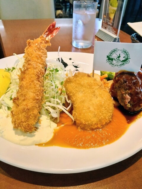 なになに、、カニクリームコロッケ、エビフライ、ハンバーグ···、ライスにデザート、食後のコーヒーも付いて3,300円とな···。