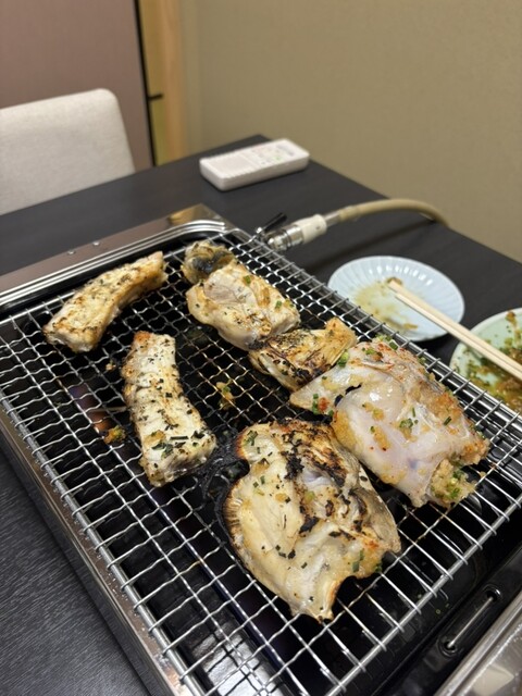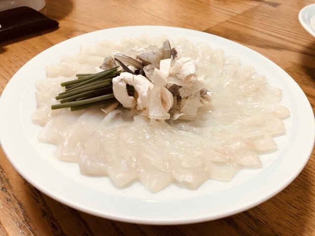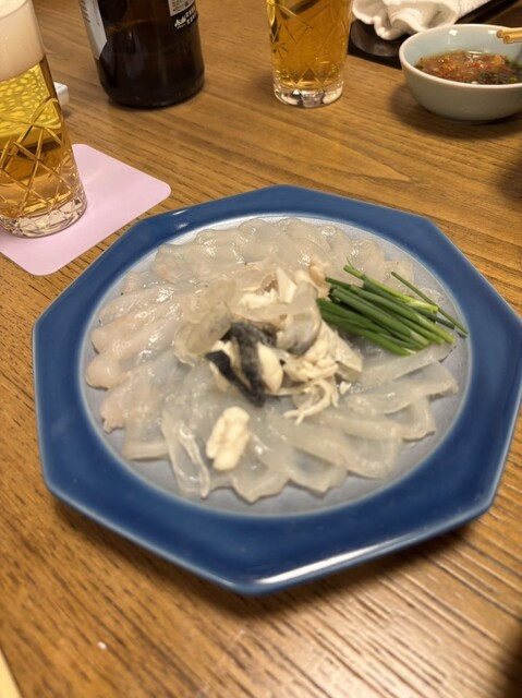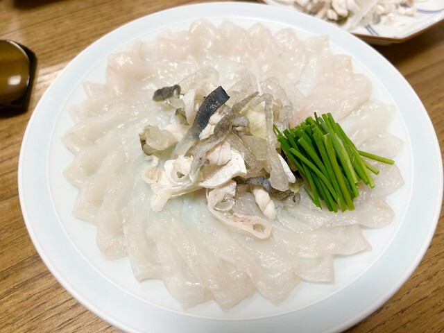 まずはてっさやフグの唐揚げ、にこごり、焼きフグなどをいただきました。てっさがおい...