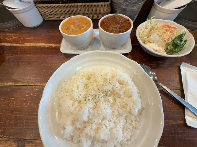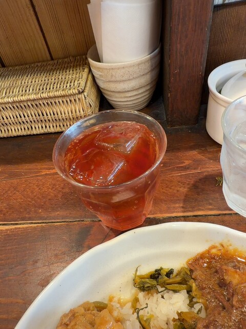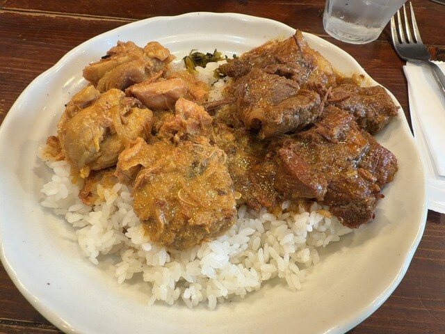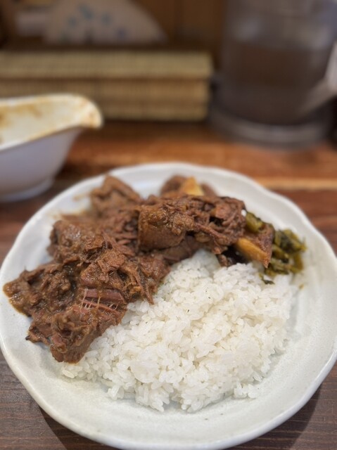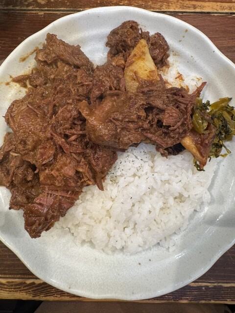 平日12時7分に到着すれば並び2名。並ぶことに。店内はカウンターのみ7席。12時12分に座れました。メニューを見て一番辛い唐辛子マーク3つ付いてる野菜マトンカリー1100円を注文。全てにホットかアイスの紅茶が付いてます。店内ワンオペで大変そう。卓上には高菜とチリパウダーが置いてあります。7分でライス... 詳細を見る