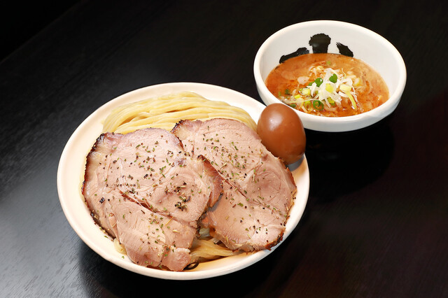 武骨同様、黒・白・赤の3つのテイストから味をお選び頂けます。 武骨相傳の「黒」はイカ墨ではなく、タマネギやニンニク、コーヒー豆をオーブンで炭化させた物を使用。ビターな味わいとなっています。チャーシューは、スチームコンベクションでじっくり焼き上げました。外は香ばしく、中はしっとりとしています。
