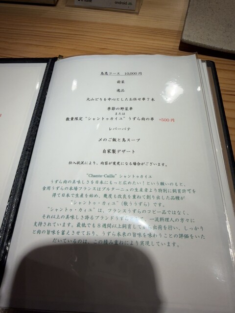 コースの野菜焼きを➕500円でうずらの焼き鳥に変更できるとのこと。色...