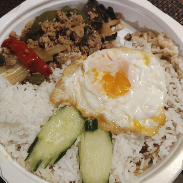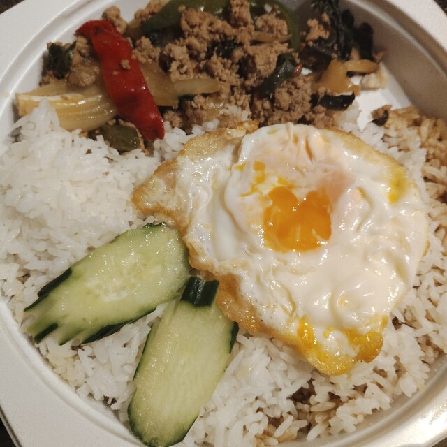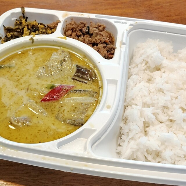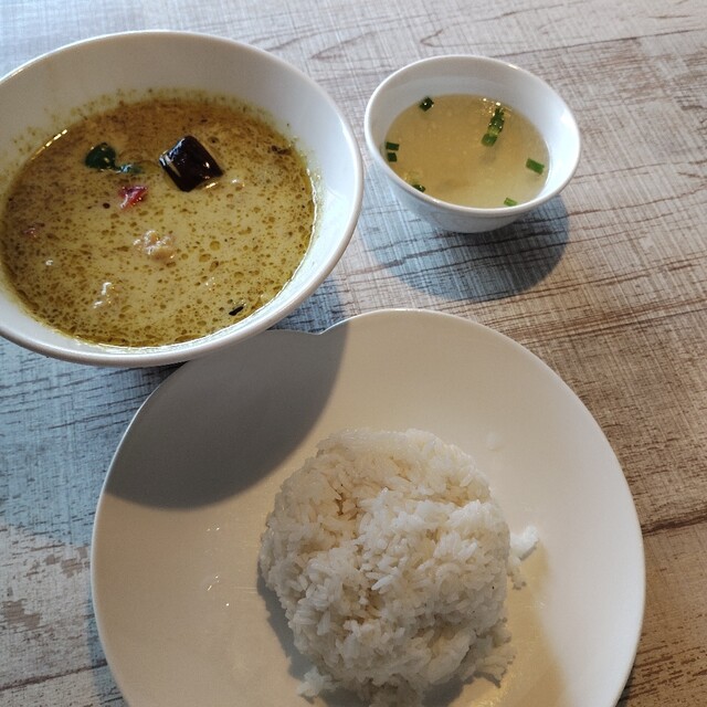初訪店して他レビで評判の良いカオソイをオーダー。店内、フロアは狭いが4Fまである様子だったが、3Fの靴を脱いで上がるタイプのフロアに通された。階段が急で気をつけて登っていくと、お風呂屋さんで見かける下駄箱があり(もちろんタイ風)鍵の木札(これもタイ風)を持って4人掛けテーブルに1人で着席。先に会計を済ませるスタイルみたいで、席でオーダー取りつつ会計も。こういうサービス大歓迎です。