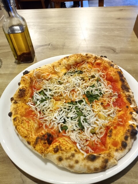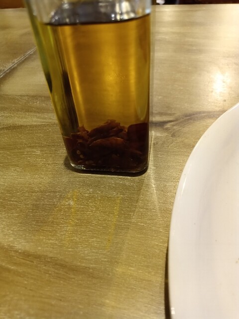 時々口の中で香るバジルとしらすの相性がピッタリ!そして、「お好みでかけてください」とオリーブオイルに漬けられたトオガラシでしょうか、それをかけることによって更に食欲アップ!あの辛味は最高です。辛いのが苦手でなければ是非かけることをオススメいたします。(ピザの種類によります)