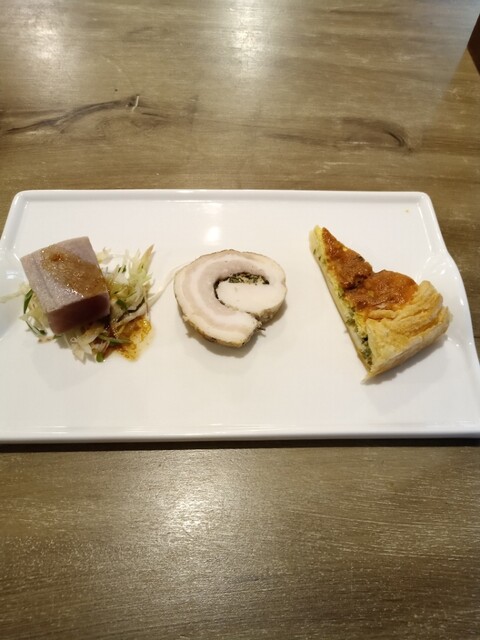 前菜3種は、まぐろのカルパッチョ、豚肉香草焼、パイ生地で覆われたキッシュ(のようなもの)。