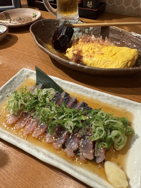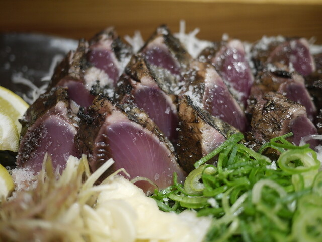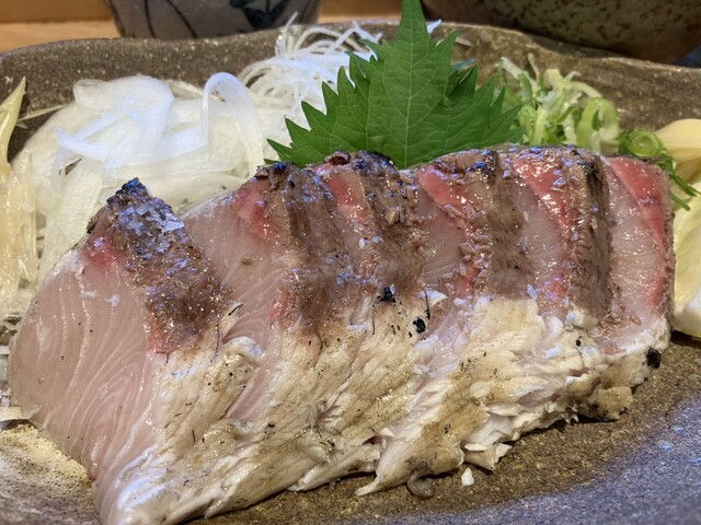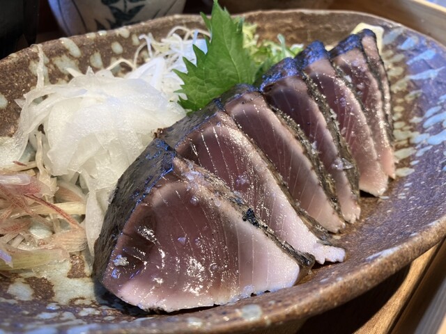 メインのかつおの藁焼き塩たたきは、香ばしい藁の香りと厚切りの食感が絶妙。塩だけで十分旨みが引き立ち、藁焼きならではの香り...