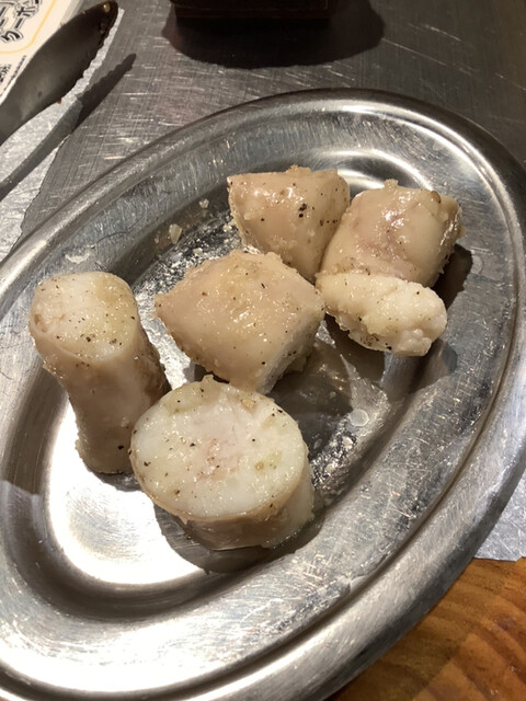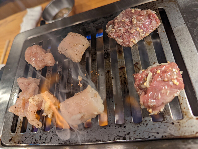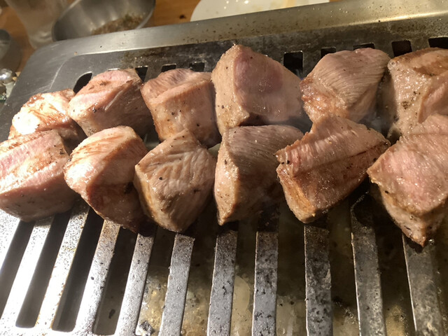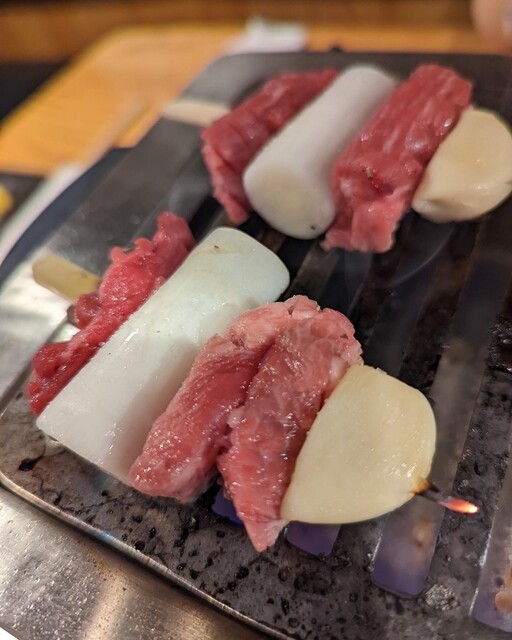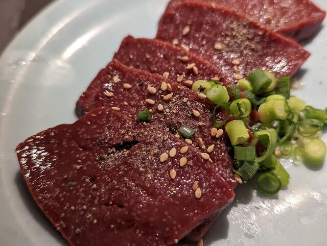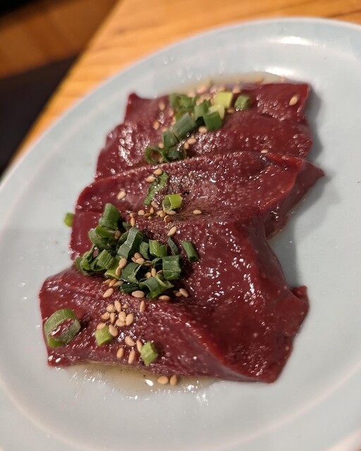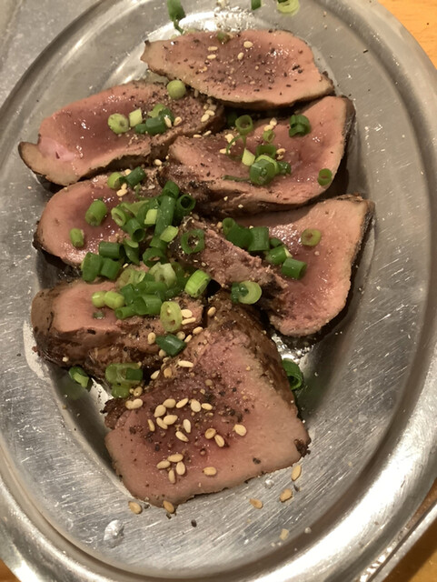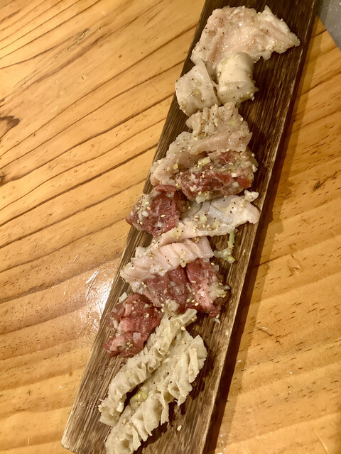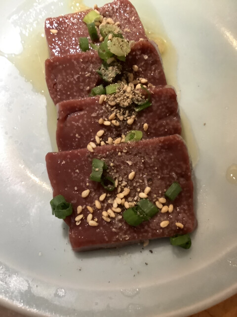 タンは串焼きタイプのを注文。ニンニクとネギは焦げすぎないよう気をつけながらじっくり焼くと甘みと旨みが凝縮されてこれもまたイイレバーも新鮮で連れもテンションアップ⤴️