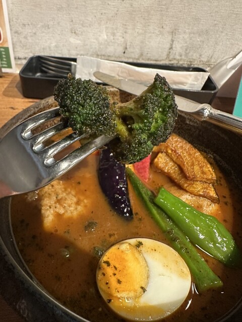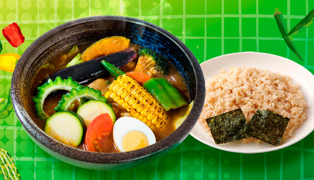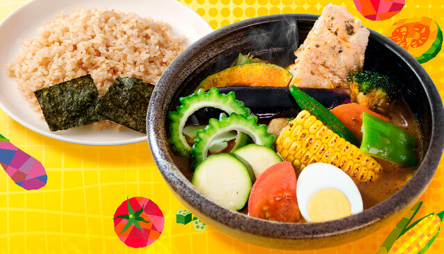 独自の製法と、ひとつひとつこだわって厳選した素材で仕上げたスープカレー。 鶏ガラ、豚骨、牛骨のほか香味野菜やトマトなど14種類の食材を、10時間以上手間隙かけて煮込み、深いコクと旨みたっぷりのブイヨンをベースに20種類以上のスパイスをブレンド。添えられた色鮮やかな野菜と柔らかチキンを一緒にじっくりお楽しみください。