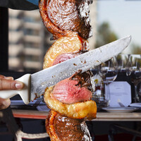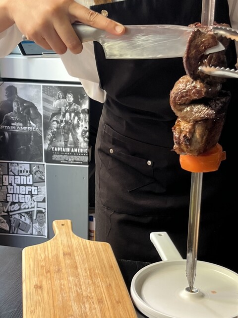 当店自慢のお肉を塊のまま豪快に串に刺し、岩塩のみで焼き上げた本格シュラスコ。一番おいしい焼きたての状態でお客様のテーブルまでお持ちし、目の前で豪快にカットします!I