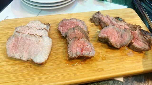 季節のアピダイザー(ブラジル風野菜炒め)、オーガニックサラダ(コブサラダ)、スパイシーポテトサラダ、シュラスコ食べ放題(ピッカーニャ、アルカトラ、フラウジーニャ、豚肩ロース、リングイッサ、アバカシ)。