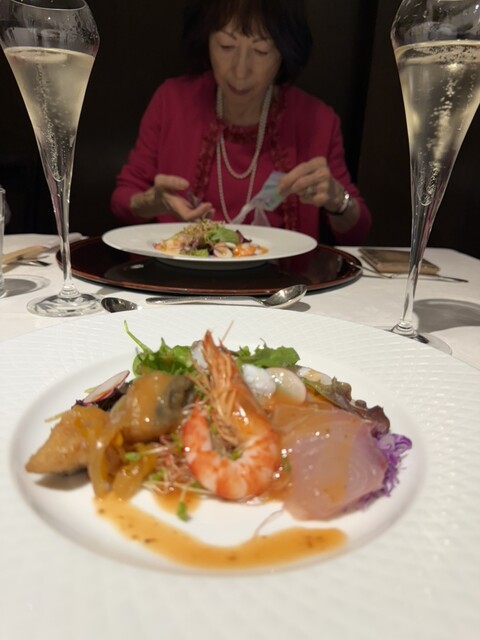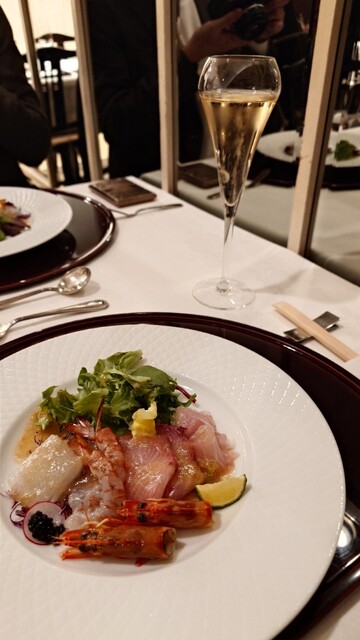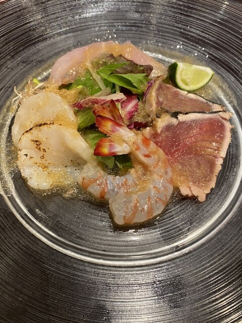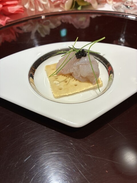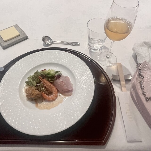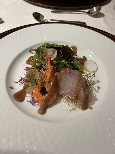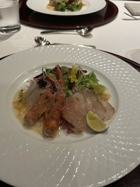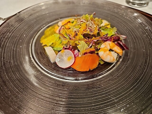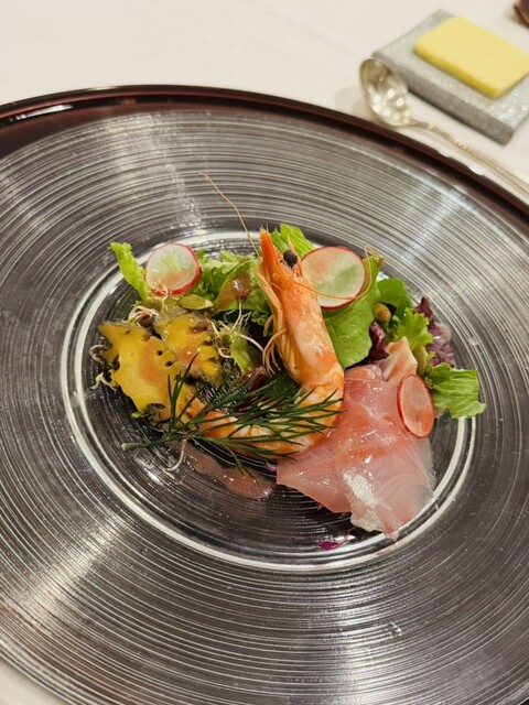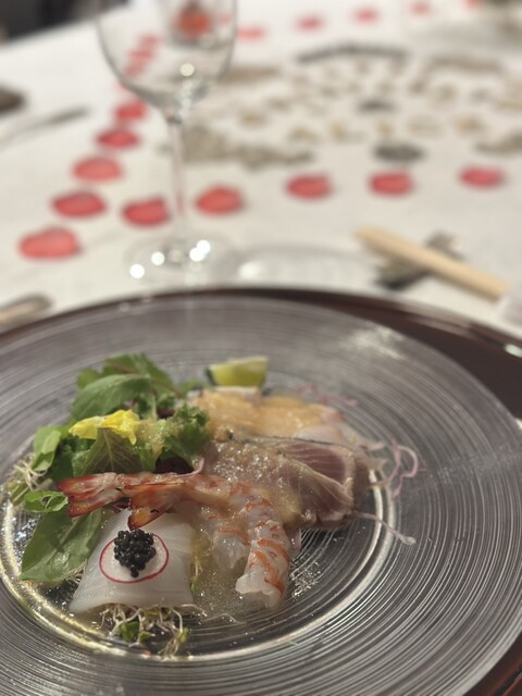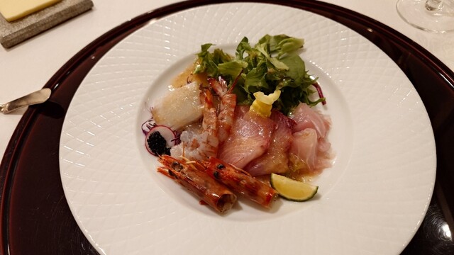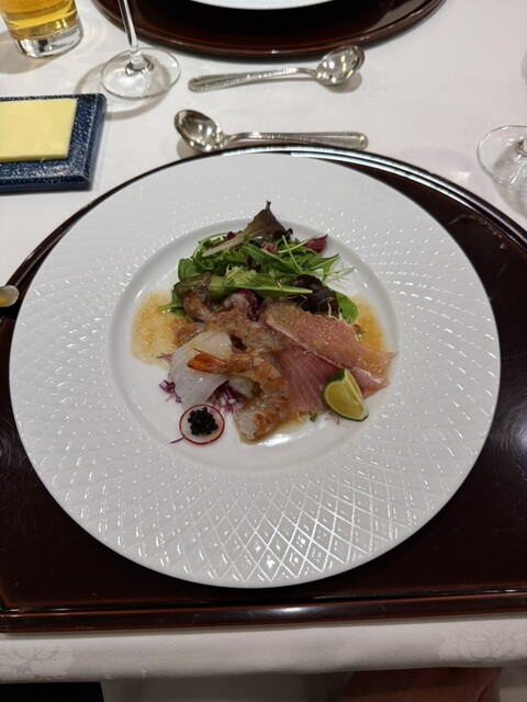 オードブルは「マナガツオ+ヒラマサ+サイマキ海老+イカ+キャビアのサラダ仕立て」でした。新鮮な魚貝類に爽やかなソースがかかり暑...