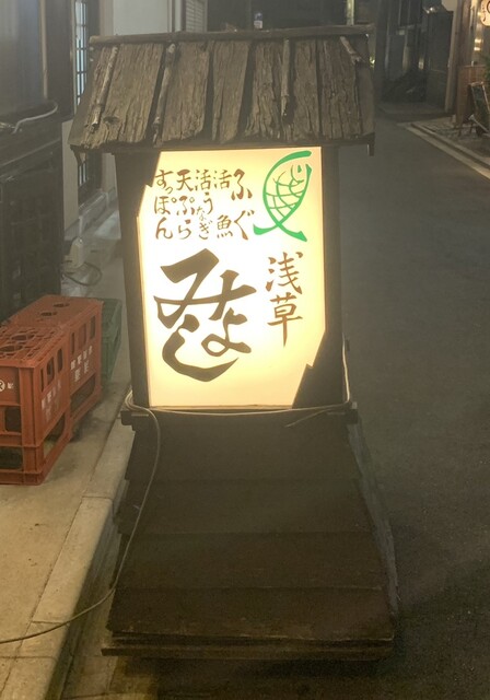 「浅草みよし 」初めての訪問となります。看板には「ふぐ、活魚、活うなぎ、天ぷら、すっぽん」が掲げられています。