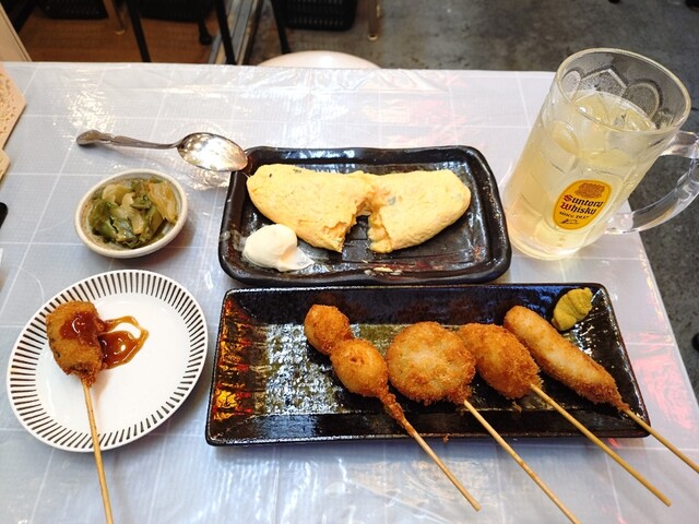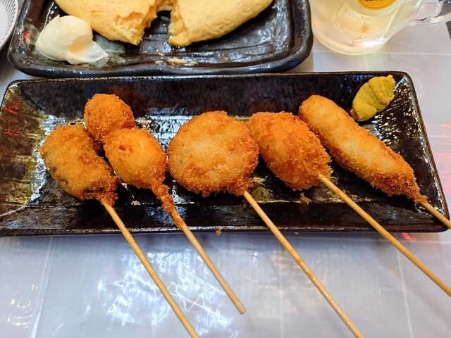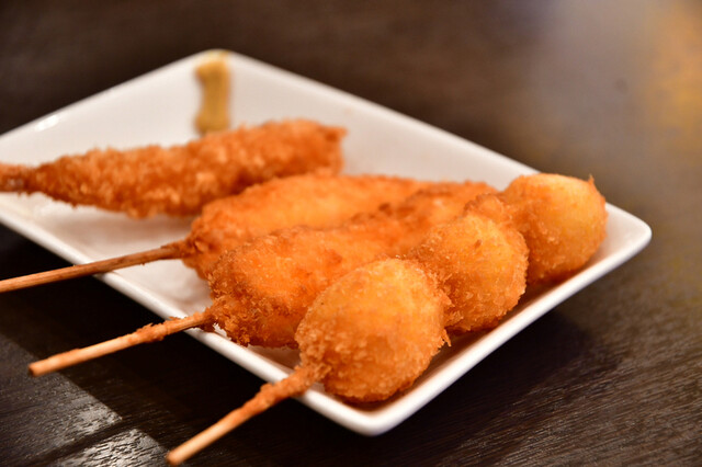 ホルモン焼き(900円)と串揚げおまかせ5本(800円)、月見つくね3本(650円)を頼みました。