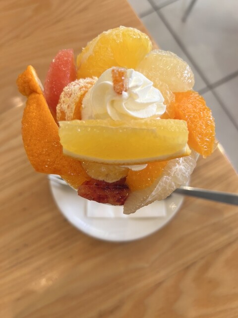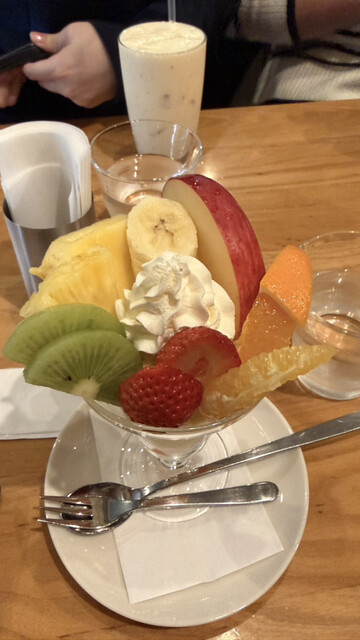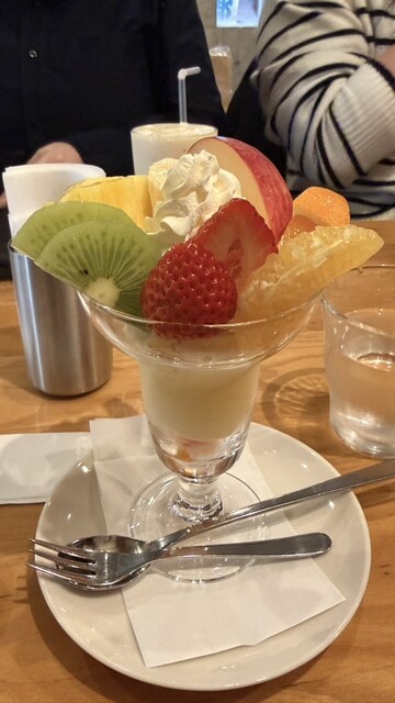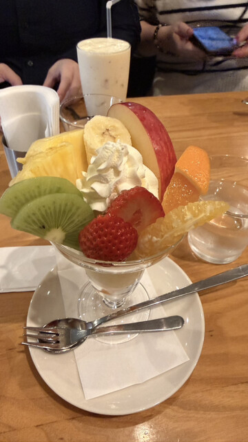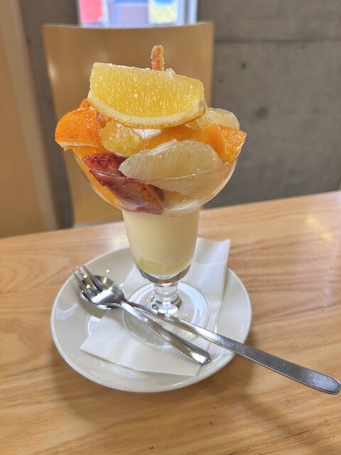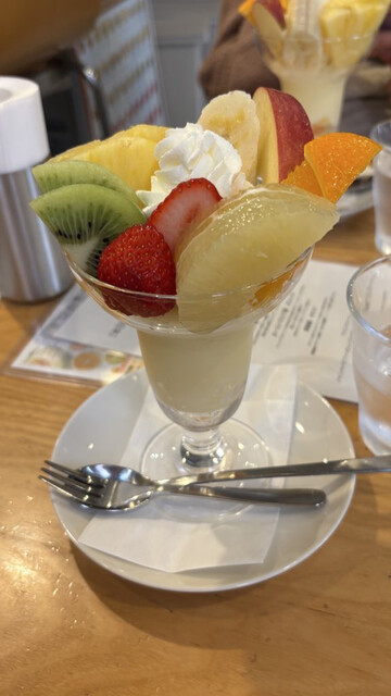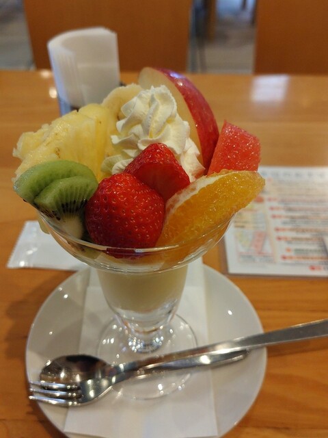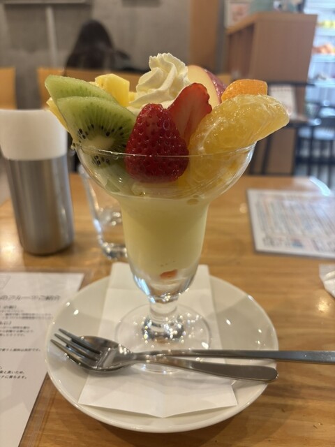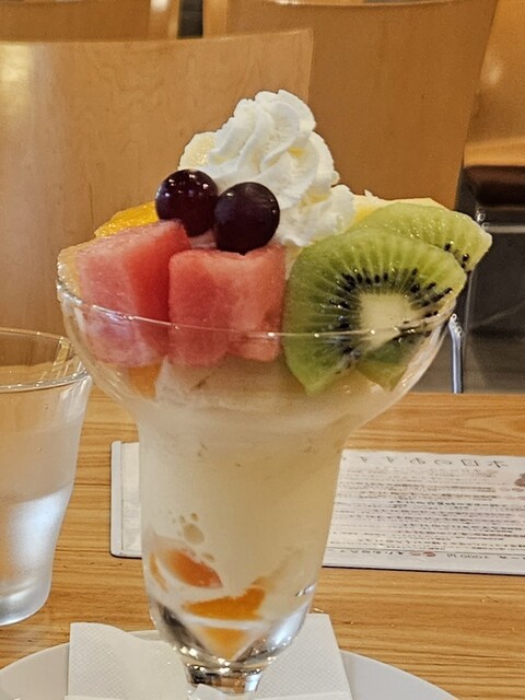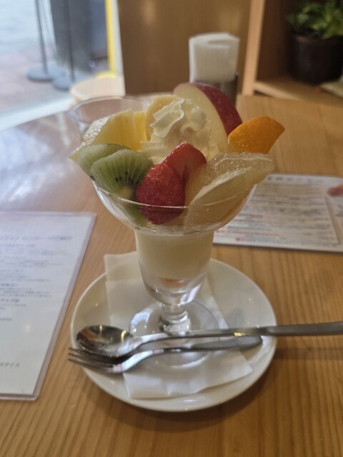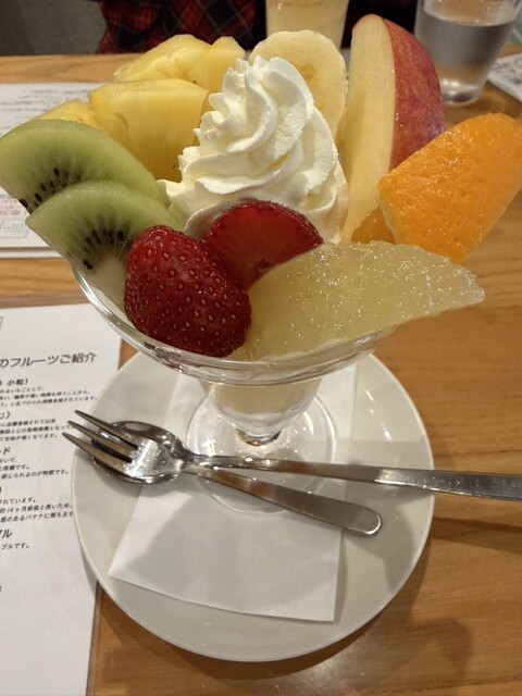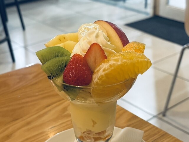 焼肉のあとに訪問。本日のフルーツパフェを注文。あまおう、サンふじ、キウイ、パイン、グレープフルーツなどが入っていて、食後でも重すぎず、フルーツそのもののおいしさをしっかり楽しめる満足度の高いパフェでした。