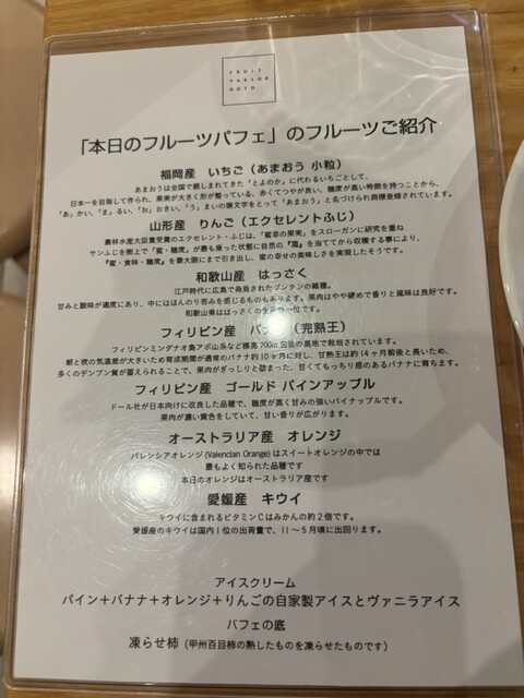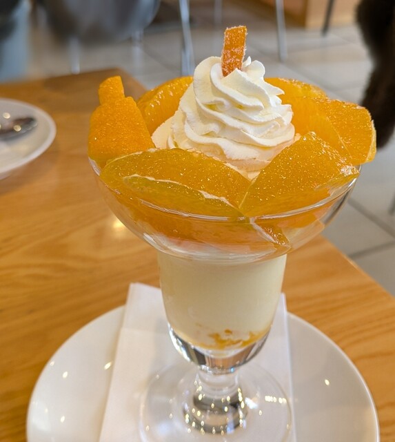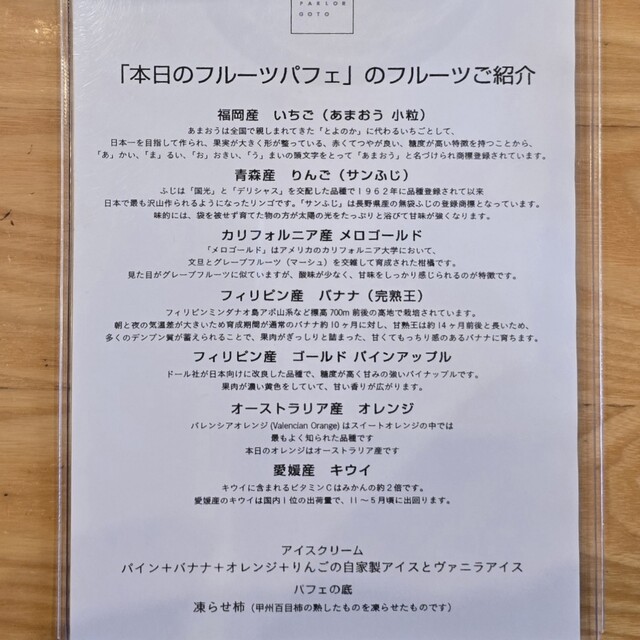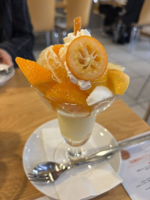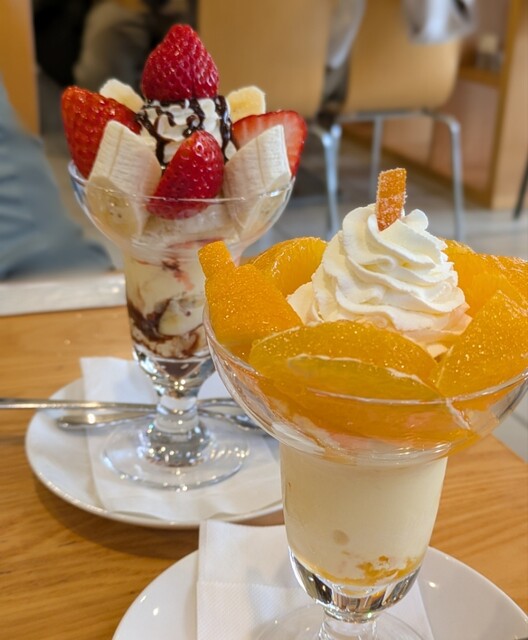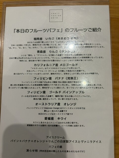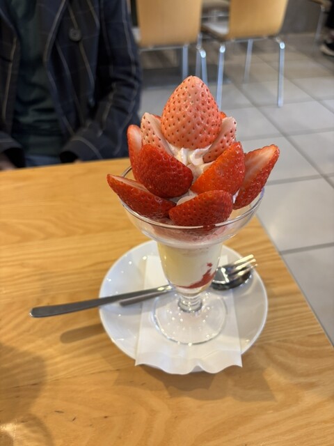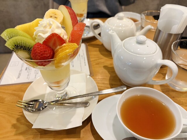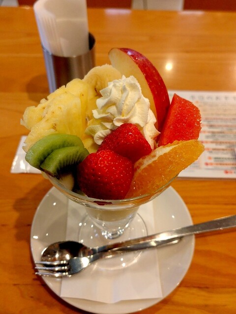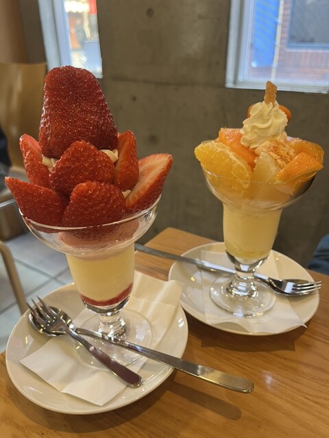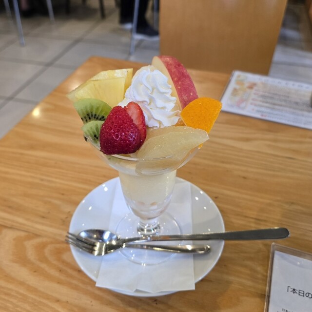 焼肉のあとに訪問。本日のフルーツパフェを注文。あまおう、サンふじ、キウイ、パイン、グレープフルーツなどが入っていて、食後でも重すぎず、フルーツそのもののおいしさをしっかり楽しめる満足度の高いパフェでした。