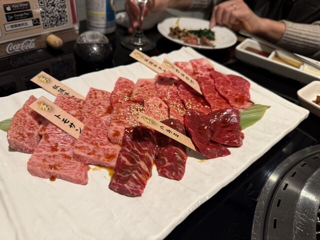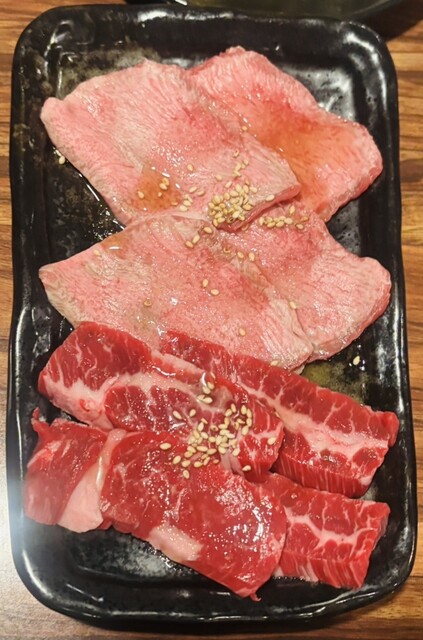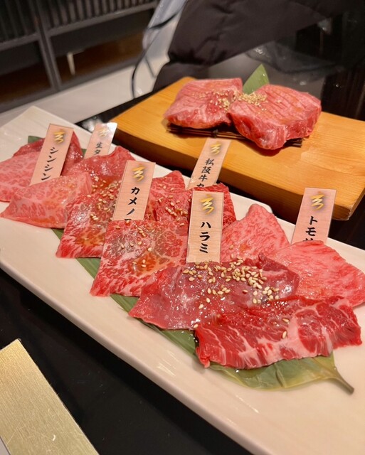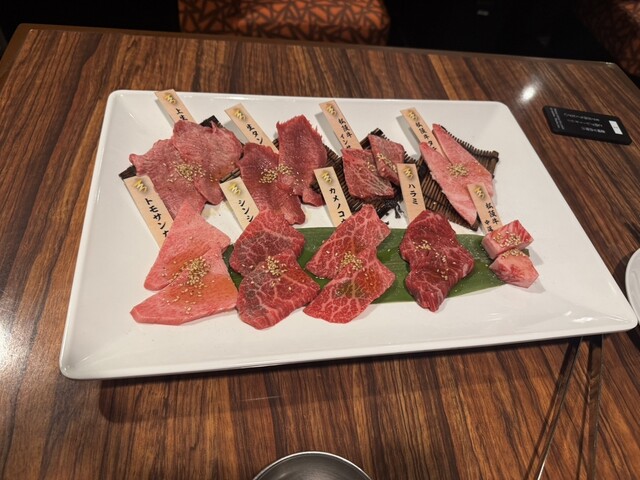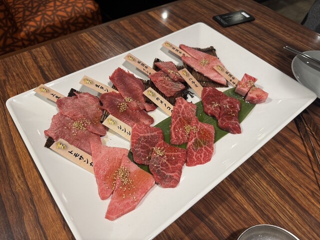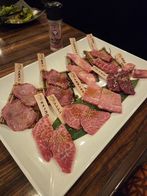 高級感のある落ち着いた雰囲気の焼肉店で「9種盛り合わせ(2人前・6,600円)」を中心にいただきましたが、これは本当に満足度が高い一皿でした。内容は 上生タン・生タン・トモサンカク・松坂牛中落ち・シン...