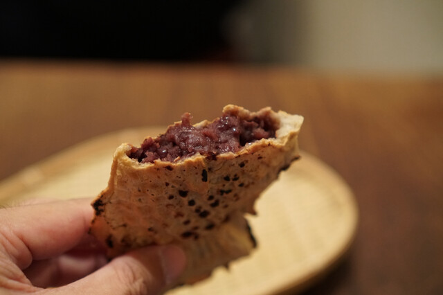 中は粒餡で、小豆本来の味が強い印象、外はパリパリめでした。