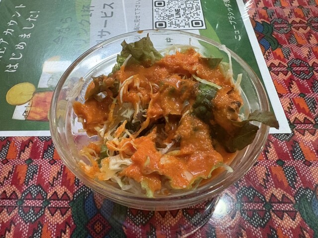 サラダはよくインドカレー屋さんにあるケチャップやマヨネーズベースですが、隠し味で香辛料がはいっています