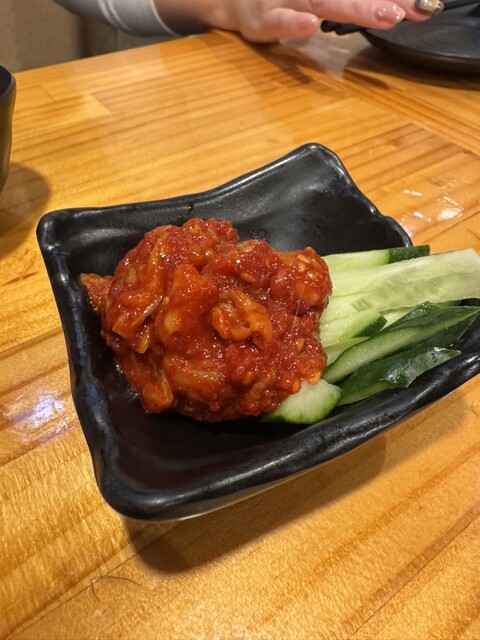 さて、我が胃袋を震わせたのは、まずは赤々とした【チャンジャ】。見るからに辛そうで、舌が警戒するが、一口食べればその塩辛さとコリコリ感、そしてキュウリとの清涼なる共演により、箸が止まらぬ地獄の無限ループへ突入。チャンジャは小悪魔である、いや、大悪魔か?