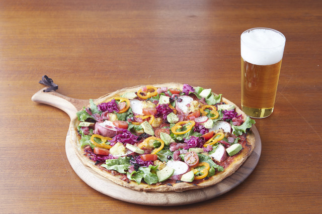 2階スタジオでのヨガや、隅田川ランニング等、気持ちよく運動したら、カラダが喜ぶメニューをご提案。お野菜、果物を使ったこだわりのスムージー、ピザ、オーガニックコーヒーなど植物性素材を使用したヴィーガンメニューをご用意。食材が本来持つ自然な色味を生かすなど彩にもこだわりあり。