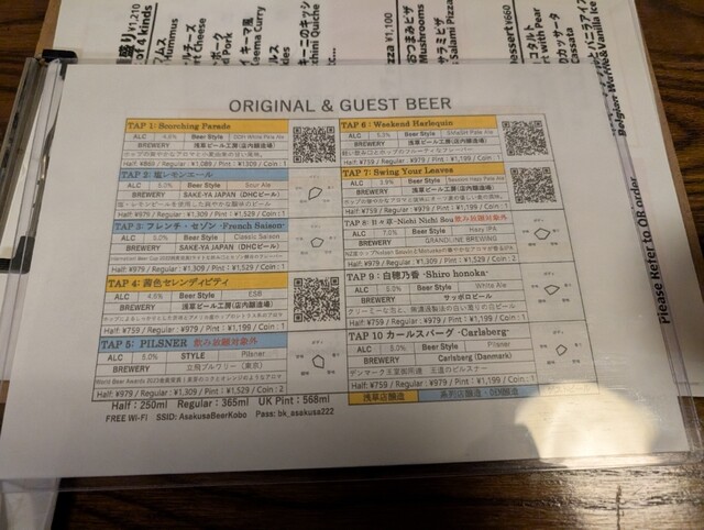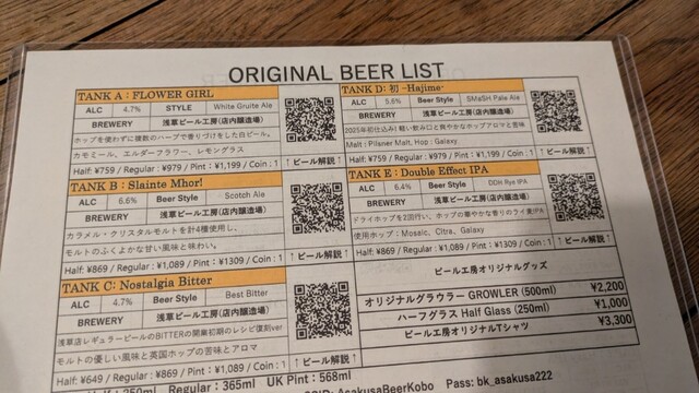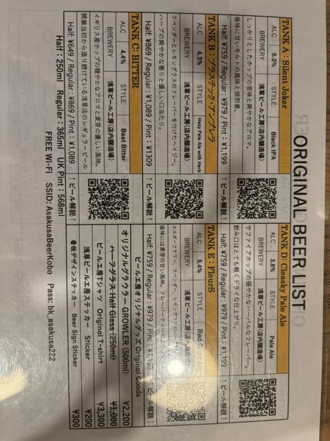 浅草方面を開拓、新宿、中野などにあるビール工房の系列、店内で醸造しているので、その店ごとのオリジナルビールが楽しめる。雰囲気のある、声がよく響く店主がいい笑顔で迎えてくれます。