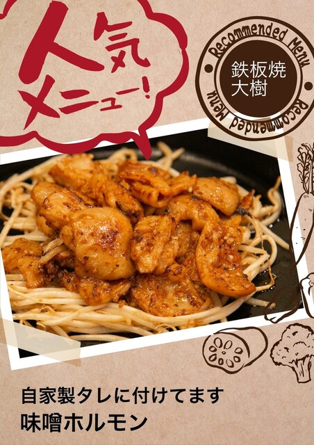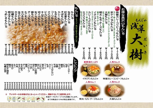 浅草もんじゃと言えばホッピー通り横丁の「もんじゃ大樹」一度食べたらやみつきの美味しさです。お酒も多数揃えており全国各地から美味しい食材を仕入れておりますので是非ご賞味下さい(当店の豚肉は全て平田牧場の三元豚)落ち着いた店内は清潔感をモットーに清掃に力を入れておりますので女性の方も安心していただけます