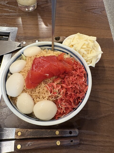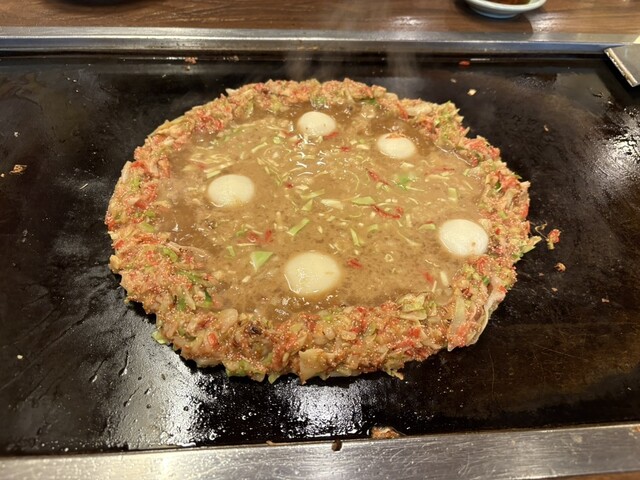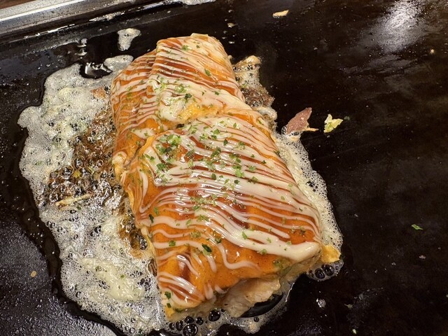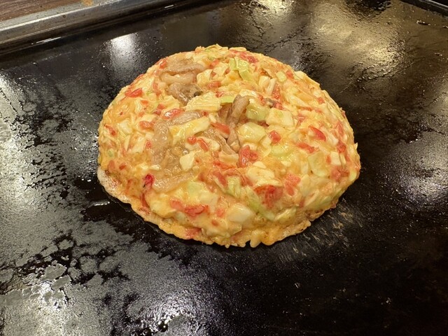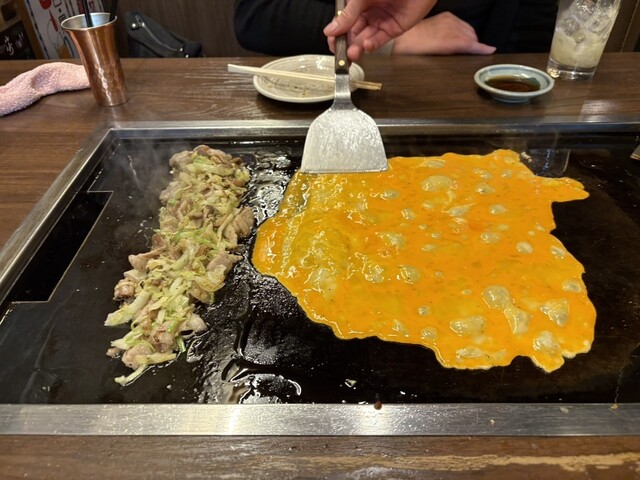 最後に、仕上げの仕上げで、豚玉¥880に紅しょうが¥100を追加トッピング。これも店員さんがフワッフワに焼いてくれて、美味いに決まってる。