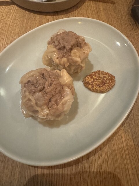 そして、、、猪の焼売!フレンチでイノシシのしゅうまいなんて聞いたことない。しかも、ディルが入っていてちゃんとフレンチ感!でも一口食べた感じは明らかな焼売感が全面にでていて、粒マスタードがあうことオレンジワインとおしゃれにあわせていただきましたが、ハイボールやビールと合わしてもいいぐらい、一口焼売を食べたら中華に来たっけ?と思わす本格焼売。話しながらめちゃくちゃ動く手元を見てたら注文してから肉だねを包み、しかも皮は浅草開化楼、蒸篭はだけじゃなくて杉で、包むヘラも本格的。脳内バグって持ち帰り用焼売も受け付けてそうな看板商品なんじゃないかレベルで美味しかった✨