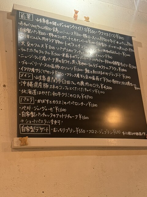 クラシカルなフレンチをベースに、日本人の口に合うようアレンジを加えた一品をご提供。日替わりでご用意したメニューは普段使いいただけます。おすすめは美味しさを最大限に引き出した豚肉料理です。またワインは、ナチュラルワインを中心にその時に美味しいものを取り揃えておりますので、料理と共にお楽しみください。店内はゆったり過ごせる隠れ家のような空間です。お仕事終わりの一杯などに、ぜひ気軽にお立ち寄りください。 |