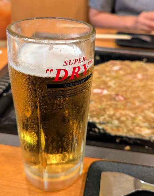 お風呂上がりのもんじゃとお好み焼き、そしてビールの組み合わせは格別でテンションが上がります。この日はゲソもんじゃと海鮮天のお好み焼きをチョイス。
