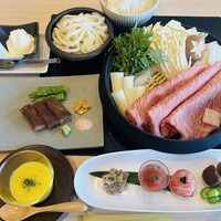 A5ランクの最上級和牛のヒレ肉やサーロインを使用した、ステーキとすき焼きの入ったコースです。 前菜からデザートまで。