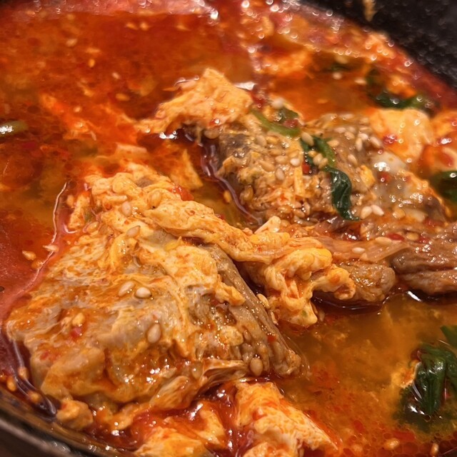 こちらのカルビスープは少し辛めでお肉の出汁がよく効いていまして、お肉がごろっと入っているので美味しいです。カルビはとろけて柔らかく一口入れるとお肉の旨みが一気に広がり美味しいです。 具材にもナムルが入っているので食感もあってこれまた旨みの相乗効果を果たしてくれます。