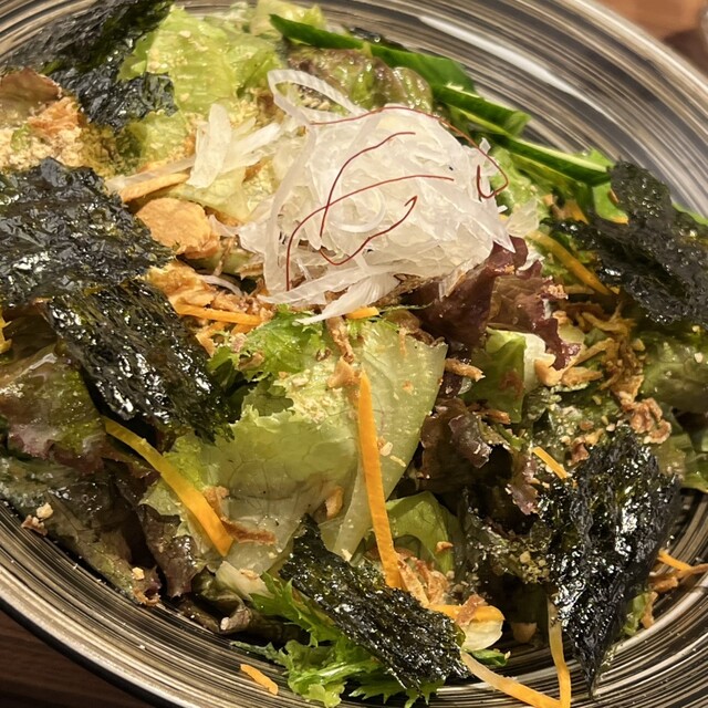 こちらのチョレギサラダは韓国海苔やガーリックチップなどが入っていて、チョレギドレッシングのさっぱりさとガーリックのガツンとしたもの韓国海苔の塩味が重なり旨みを引き立ててくれます。一口頂くとやみつきになります。