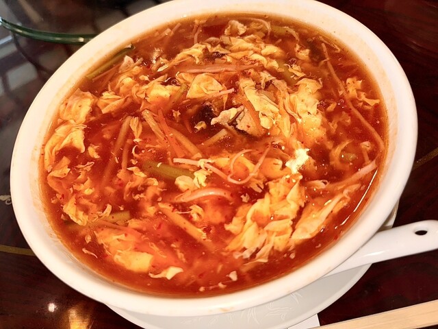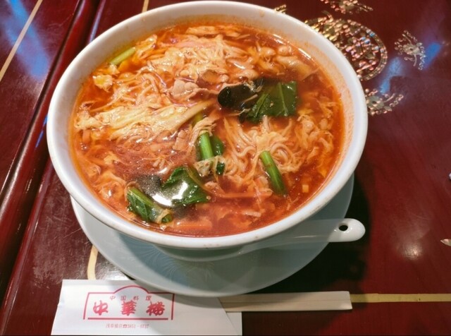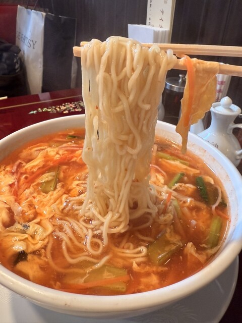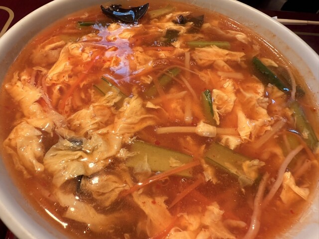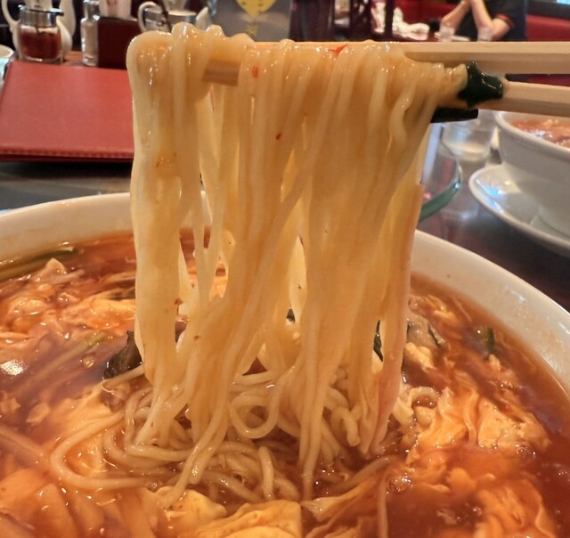 中華楼 本店の酸辣湯麺は、辛さと酸味が見事に調和した一杯だ。スープは深い旨味とともに、ピリッとした辛さと爽やかな酸味が絶妙なバランスで広がり、食べるたびに体が温まる。