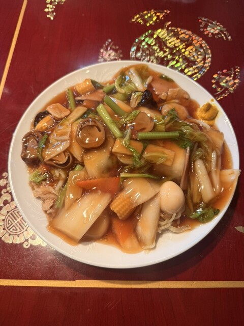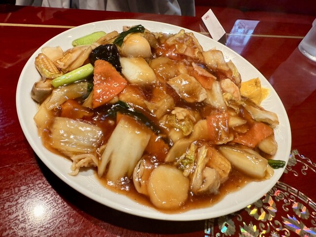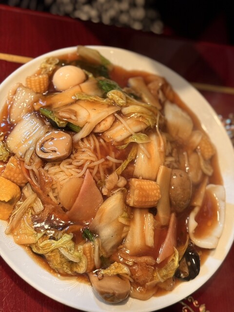 最後にいただいたあんかけ焼きそばは、具材がたっぷり入っており、あんのとろみが絶妙です。麺の香ばしさとパリパリの食感が特徴で、しっかりとしたあんが麺に絡むことで、海鮮や野菜の旨味が引き立ち、食べ応えも十分。焼きそばの麺と具材の食感のコントラストが素晴らしく、味のバランスも抜群で、最後まで飽きることなく楽しめました。