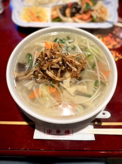 中華楼 本店の「たっぷり野菜ときのこの塩味おそば」は、食べる前から視覚で圧倒される一品です。たっぷりの新鮮な野菜の上に贅沢に盛り付けられたきのこが、見た目にもボリューミーで食欲をそそります。スープは、上品な塩味で野菜ときのこの旨味を引き立て、口に運ぶたびに素材の自然な甘みとコクがじんわりと広がります。