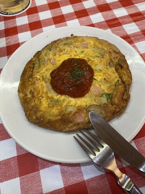 スペインオムレツは、野菜が入っていてスパイスシーなソースがかかっており、美味しいです。