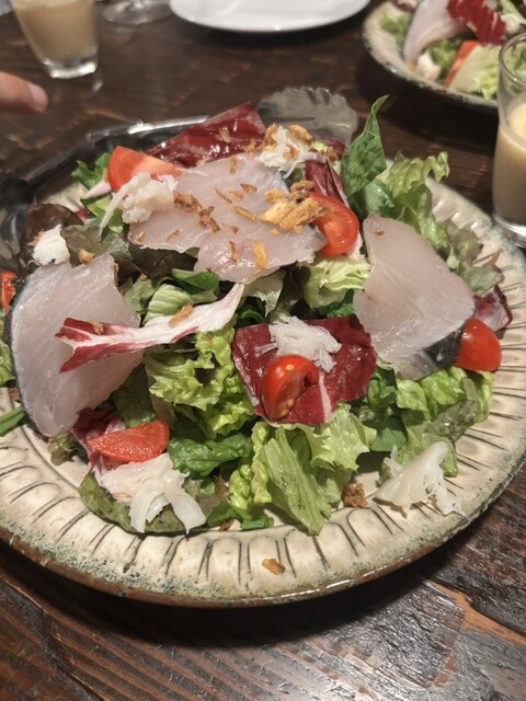 お料理は、どれも美味しい。日によってメニューは変わるようです。最初はサワラだったでしょうか刺身の乗ったサラダ(ドレッシング別盛りでたっぷり)フランスパンとクリームチーズ(このクリームが絶品!)、ナスと白子の揚げ出し(出汁が美味しい)、エビマヨ〈エビ...
