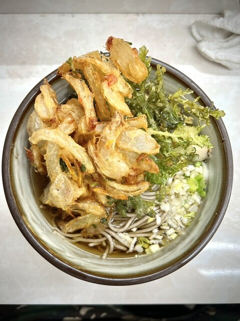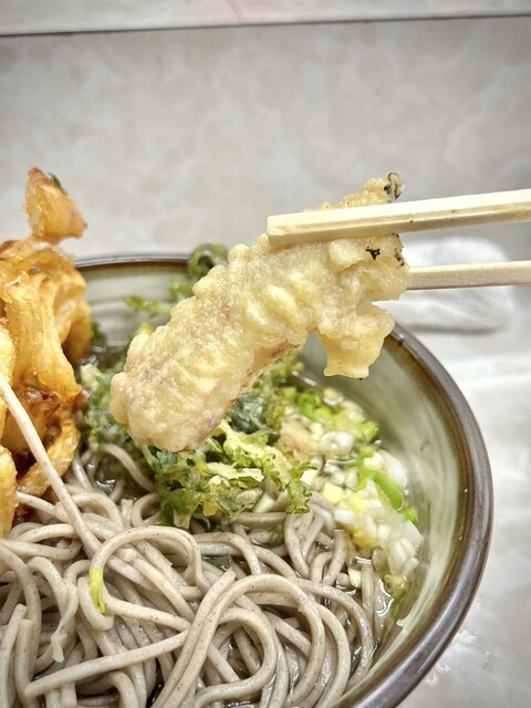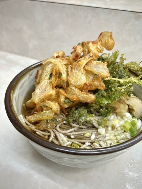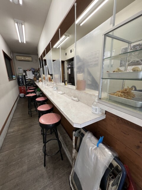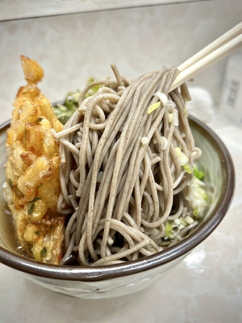 鶯谷駅から歩いたらおそらく10分位、住宅街の中にポツンと佇んでいます。 店に入ると蕎麦かうどんか聞かれ、蕎麦(¥300)、春菊天(¥80)、紅生姜天(¥80)を注文。 店の奥にある給水機で水を汲んで空いてる席で待ちます。先客は常連1人と、奥のカウンター席とは別の所に座っている、女将さんの友人らし... 詳細を見る