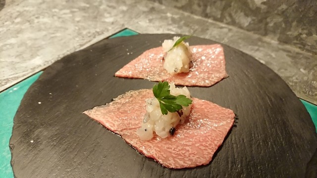 スレートに乗せられ登場したのは、ほんのり炙られたロースの上に海老と帆立のタルタル的なものがのったやつ。