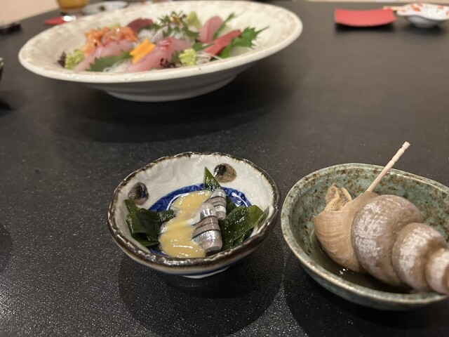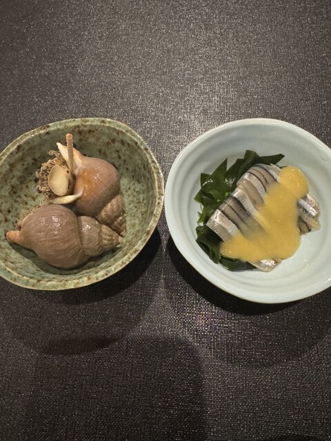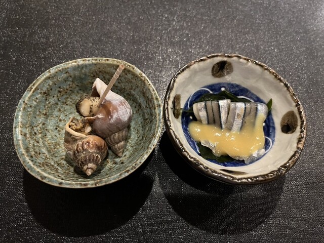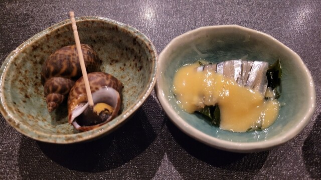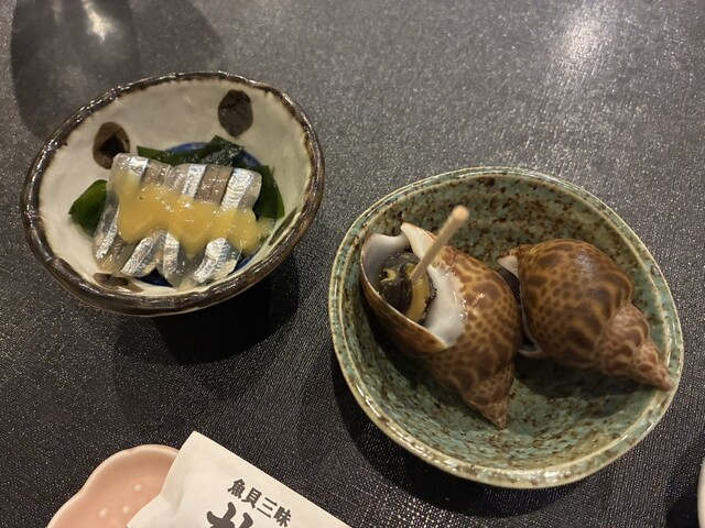 突き出しは、つぶ貝ときびなごの酢味噌和え。