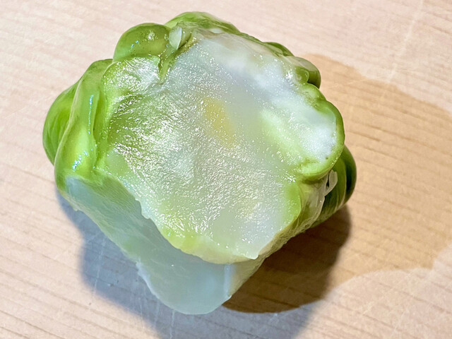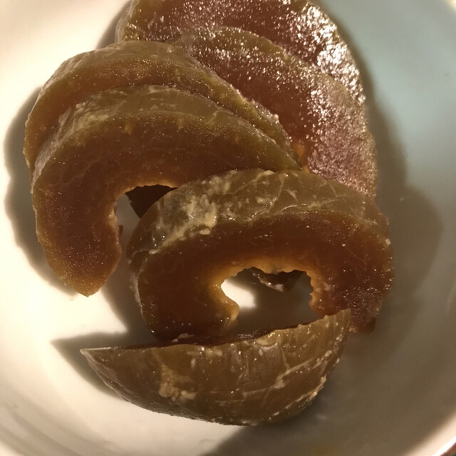 天日干した宮崎産大根を樽で長期間醗酵熟成させた、昔乍の古漬沢庵です。梔子色に染まってます。姫榊の様な香がします。乳酸醗酵で生じた酢酸エチルや乳酸エチルが齎す果実臭と、大根の硫黄化合物とが調和した風味です。ポリ/\と硬く、程好く歯切れます。甘...