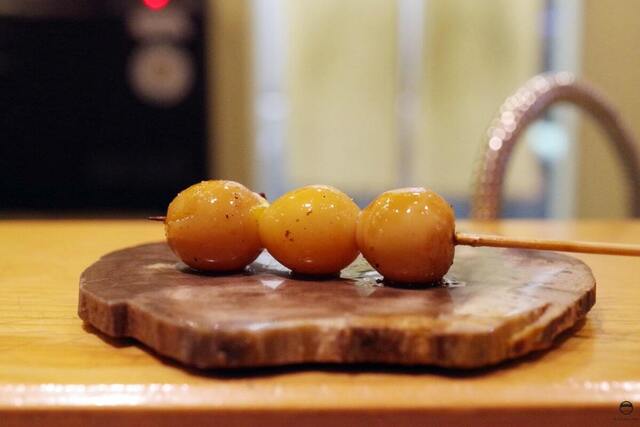 つくねを先に食べ醤油漬けの卵黄を直ぐ食べて口の中で完成させるつくね玉子も面白い。
