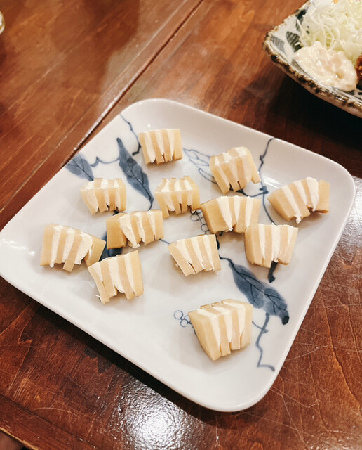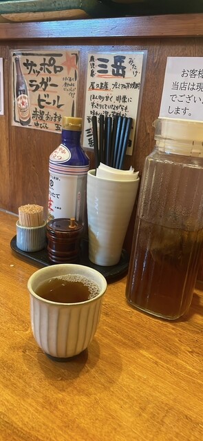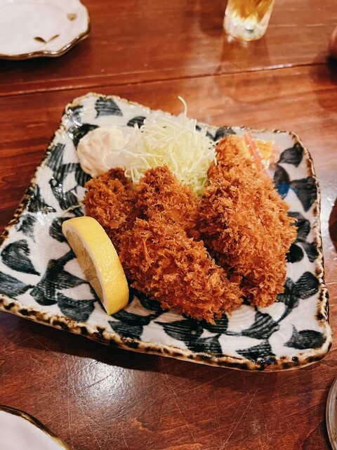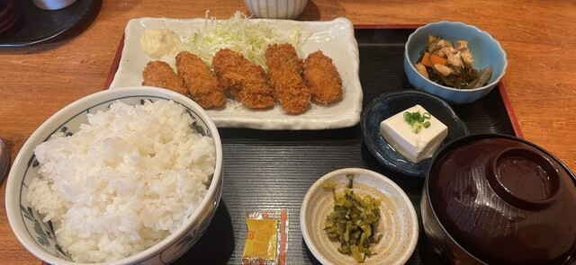 平日13時頃訪問です。キレイな通りに居酒屋さんがありランチメニューが外に出てました。店内はこじんまりとした居酒屋さんで、カウンターやテーブル席などほぼ満席。席に案内されメニューを見て牡蠣フライ定食をご飯大盛りでお願いしました。卓上の麦茶を注ぎながら待つ事5分程で料理到着です。