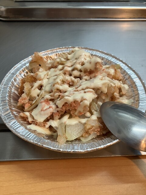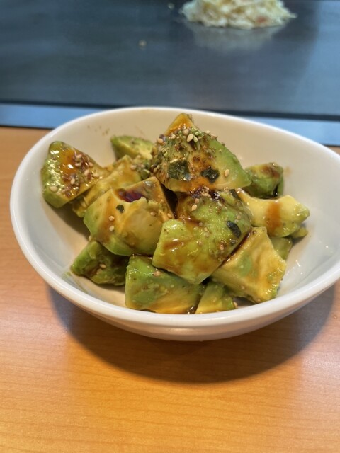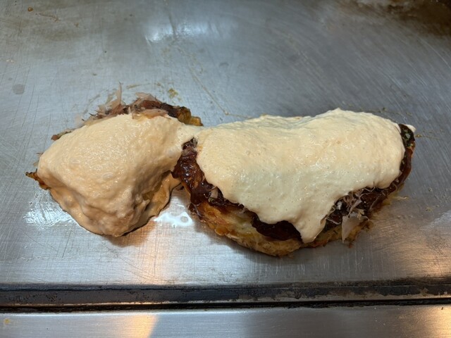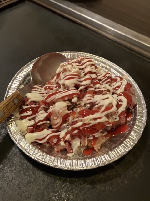 前回食べられなかった雪見ソースのお好み焼き(ミニ)を注文。雪見ソースはとろろとマヨネーズを混ぜたもののようです。雪見ソースをかける前に写真を撮らせてくださるなど終始...