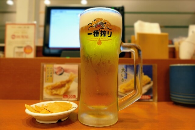 平日の夜残業後に訪問しました 店内5割ほどの入でしょうか カウンターに座りポチったのは ※税込表記 ⚫︎生ビール540円 ⚫︎たれづけ大江戸天丼1050円 ⚫︎ご飯... 詳細を見る