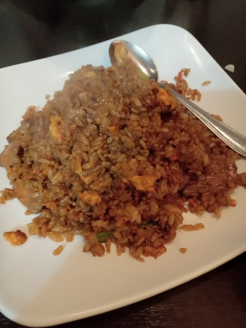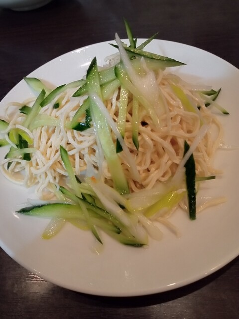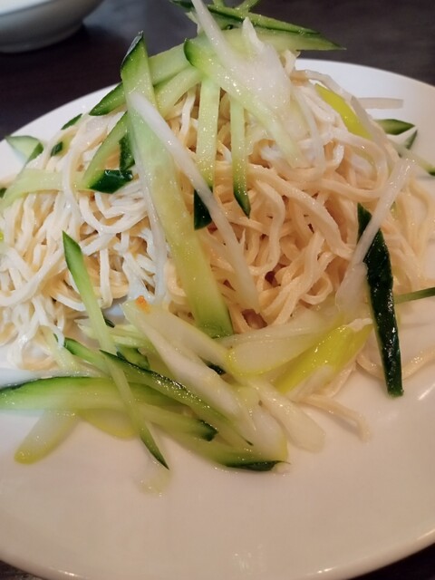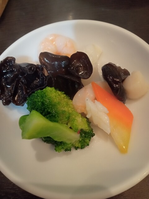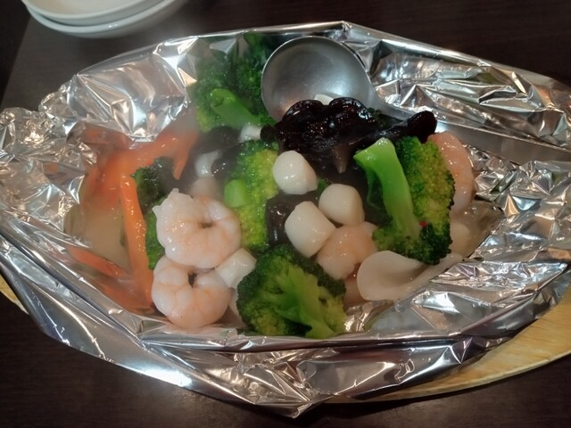 まず、干し豆腐の提供。きゅうりと長ネギと和えたもの。美味しい。鉄板焼きは、鉄板で焼いたものではなく、鉄板をアルミホイルで巻いたものを皿にしてあります。ご愛嬌ですね。内容は、エビ、イカ、ホタテ。そして、ブロッコリー、人参、木耳。XO醤炒めかなぁ?塩味炒めのように思えるが、美味しくはありますが。