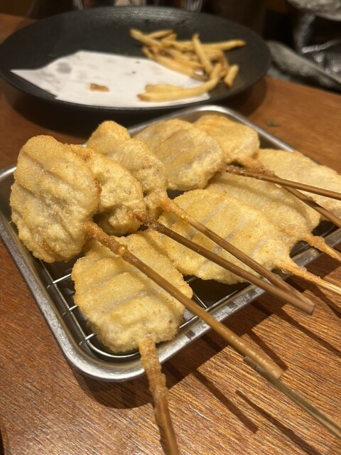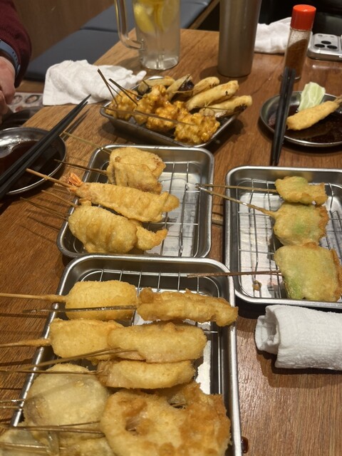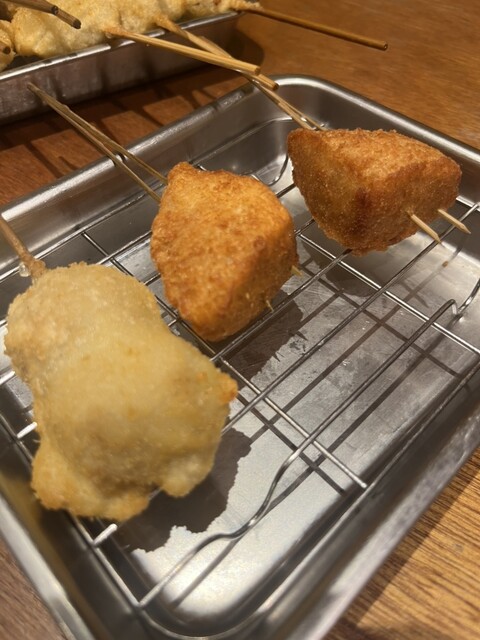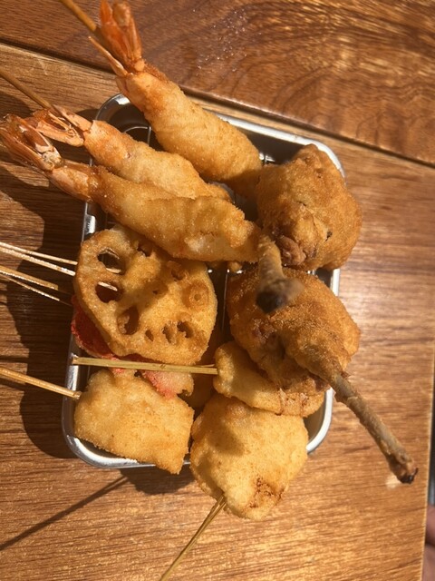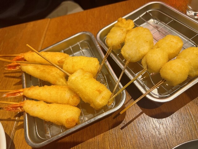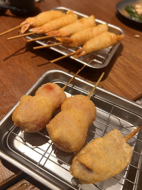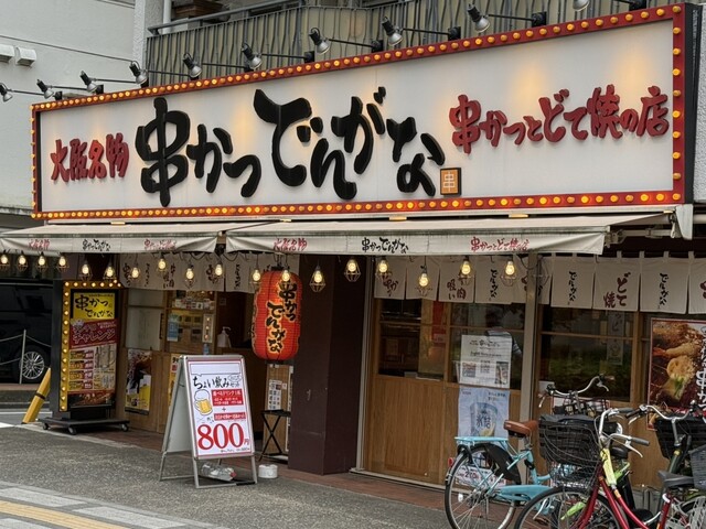 「串カツでんがな」は、大阪名物の串カツを気軽に楽しめる居酒屋チェーンです。店内は明るくて活気があり、どこか昭和レトロな雰囲気が漂います。仕事帰りの一杯や友人同士の集まりにもぴったりで、初めてでも入りやすいカジュアルさが魅力です。串カツは注文を受けてから揚げるスタイルで、衣はサクッと軽く、素材の味を引き立てます。定番の牛串やレンコン、アスパラに加え、チーズや紅しょうがなどの変わり種も豊富。特製ソース...