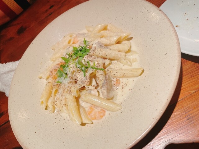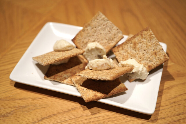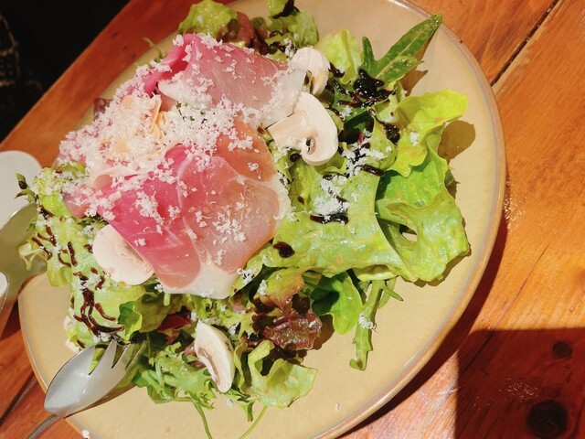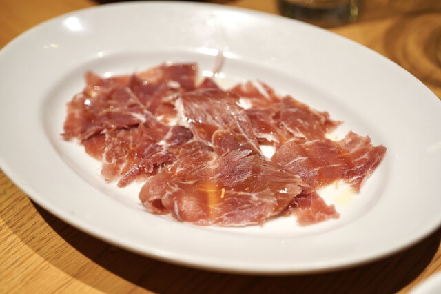 平日20時頃訪問です。予約していきました。照明の明るいカジュアルバーな雰囲気の一階での食事です。メニューを見ても値段は書いてないので、携帯で注文する際にお値段はチェックです。と言ってもお値段は比較的安めなので、安心して飲み食いできます。お通しはクラッカーとクリームチーズ。クラッカーが美味しく甘さも程よいクリームチーズもビールにあいました。生ハムのサラダはルッコラの味が強くバルサミコ酢も適量で美味し...