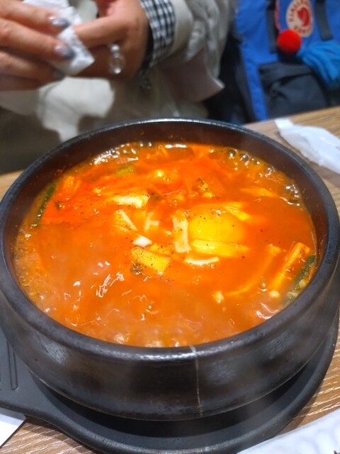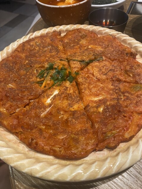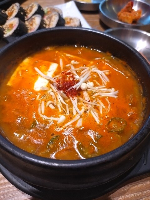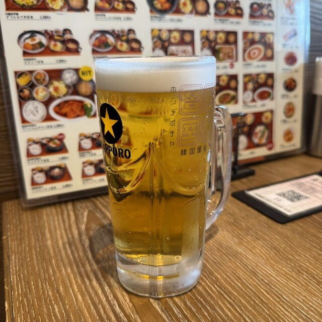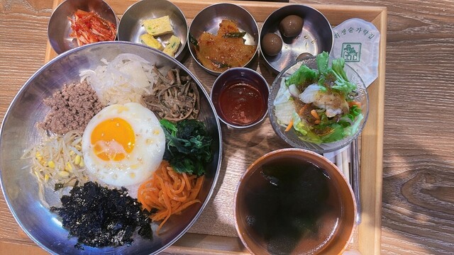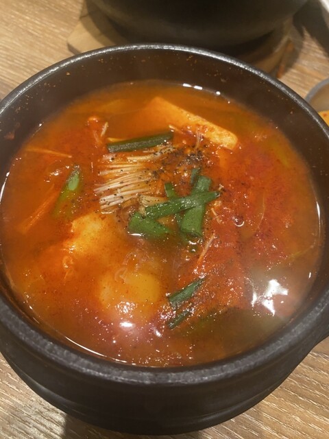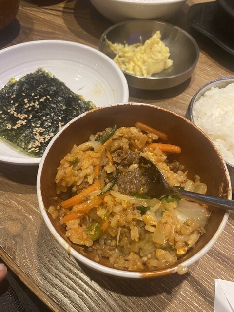 平日13時頃訪問です。ビルの中のお店にはエレベーターで向かいます。エレベーター降りるとすぐお店でした。店内は韓国居酒屋な感じのネオンサインやドラム缶のようなテーブル、そしてK-popの映像がモニターから流れてました。この時間は外からの光も入ってくるので明るいお店です。ボックス席に座りメニューを見ると、ランチメニューの種類が多く悩みましたが、今回はビビンバ定食をお願いしました。周囲はお一人様も多く、...