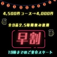 お得♪【早割りコース!】19時までの宴会スタートで全9品2.5時間飲み放題コース4500円→4000円で提供!9品